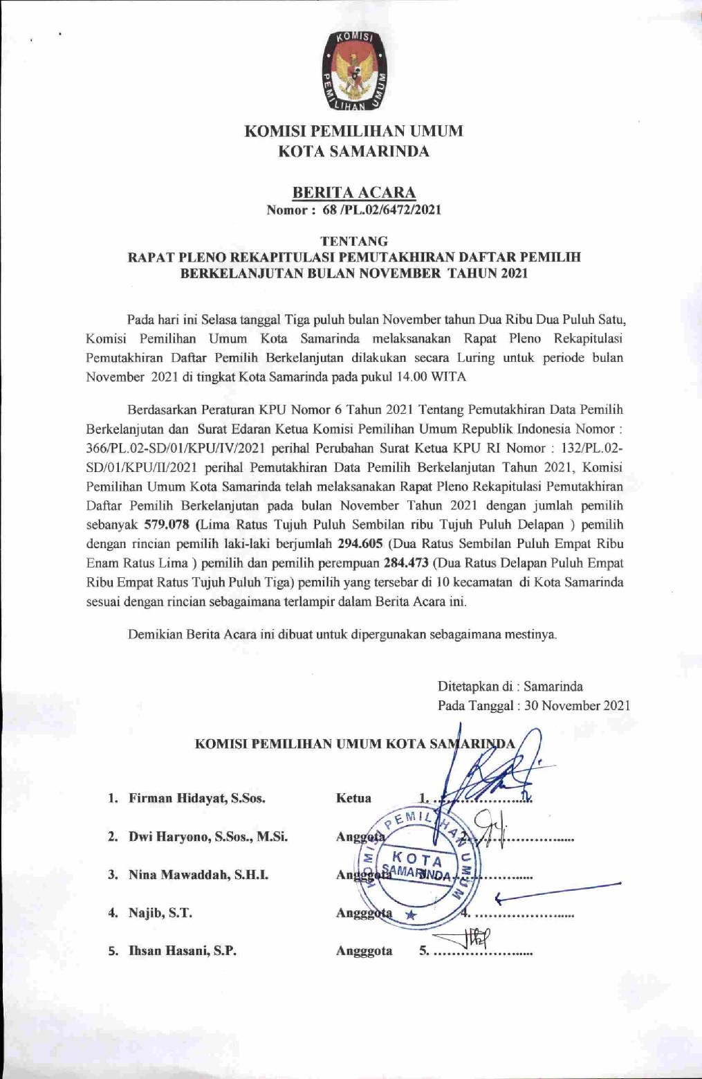Rapat Pleno Penetapan Daftar Pemilih Berkelanjutan (DPB), KPU Kota Samarinda, menetapkan jumlah pemilih laki-laki sebanyak 294.605, jumlah pemilih perempuan sebanyak 284.473, sehingga jumlah pemilih di Kota Samarinda adalah sebanyak 579.078, ditetapkan di Kota Samarinda pada tanggal 30 Nopember 2021. Berikut adalah Berita Acara Rapat Pleno Penetapan DPB Bulan Nopember 2021