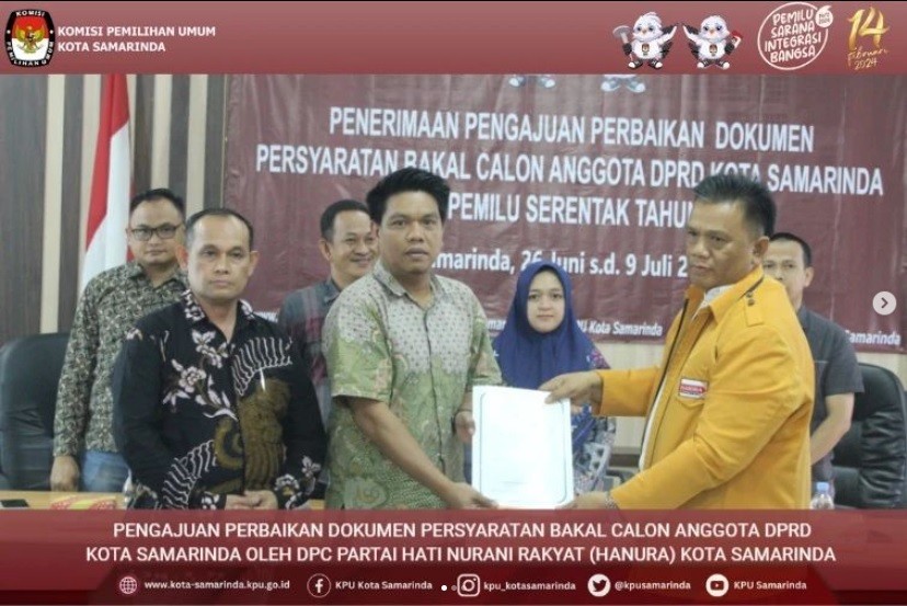 Partai Hati Nurani Rakyat (Hanura) mengajukan perbaikan dokumen persyaratan Bakal Calon Anggota DPRD Kota Samarinda Pemilu Tahun 2024, Sabtu (8/7/2023) di Kantor KPU Kota Samarinda.