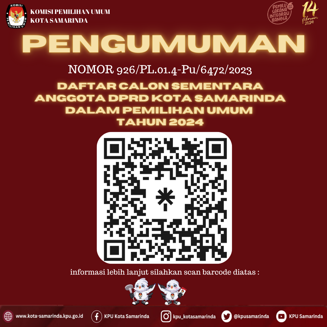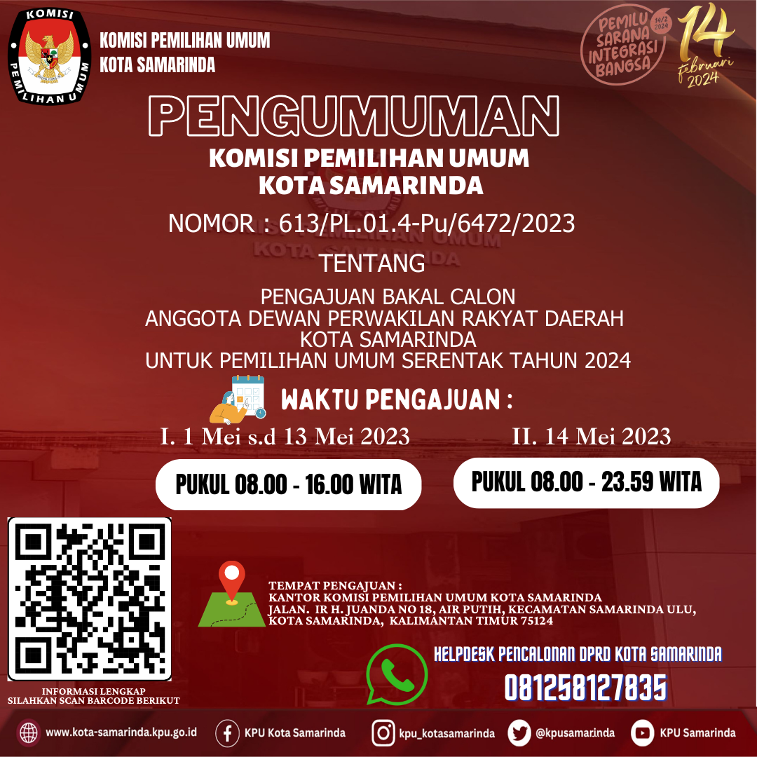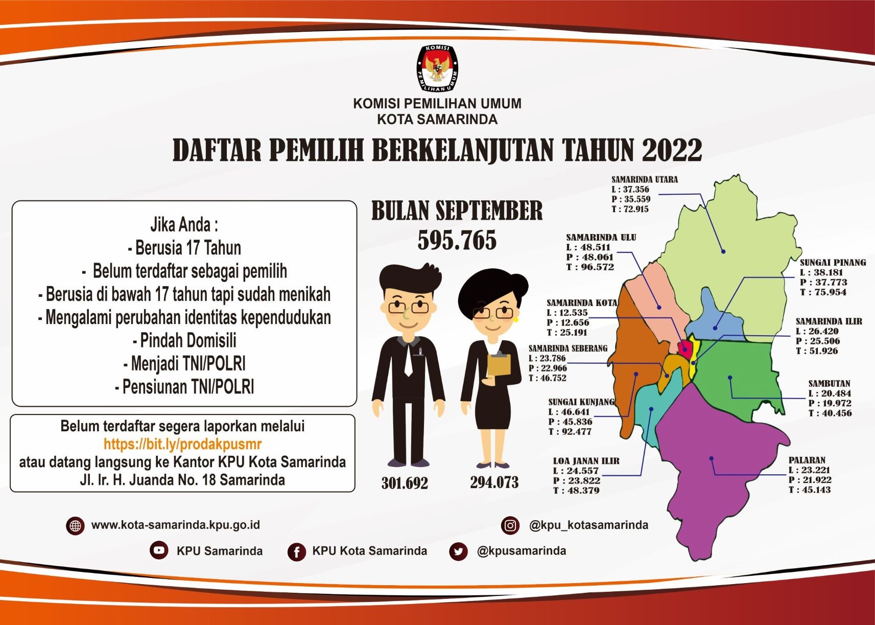 Rapat Pleno Penetapan Daftar Pemilih Berkelanjutan (DPB), KPU Kota Samarinda, menetapkan jumlah pemilih laki-laki sebanyak 301.692, jumlah pemilih perempuan sebanyak 294.073, sehingga jumlah pemilih di Kota Samarinda adalah sebanyak 595.765, ditetapkan di Kota Samarinda pada tanggal 30 September 2022.