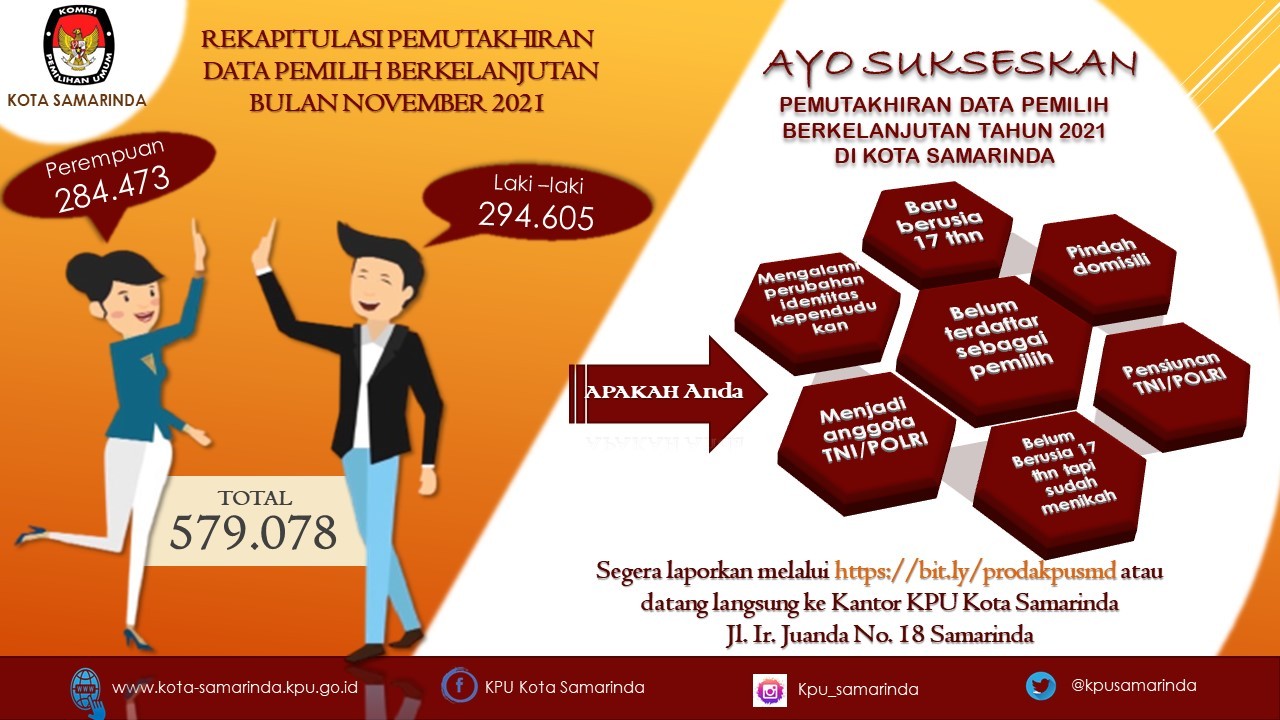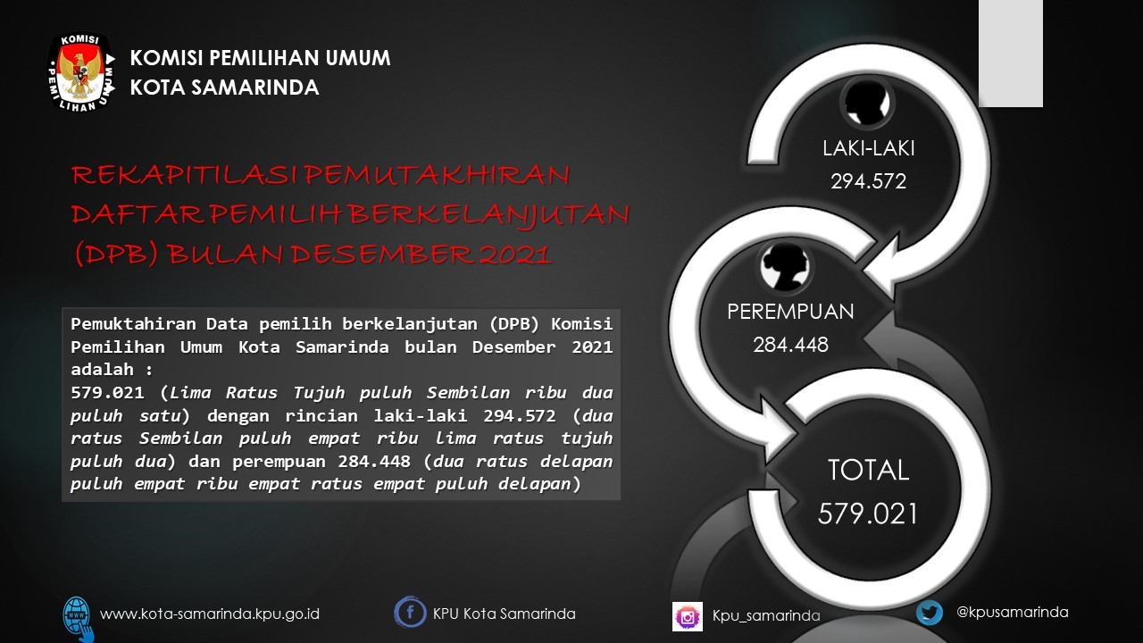 Rapat Pleno Penetapan Daftar Pemilih Berkelanjutan (DPB), KPU Kota Samarinda, menetapkan jumlah pemilih laki-laki sebanyak 294.629, jumlah pemilih perempuan sebanyak 284.488, sehingga jumlah pemilih di Kota Samarinda adalah sebanyak 579.117, ditetapkan di Kota Samarinda pada tanggal 30 September 2021. Berikut adalah Berita Acara Rapat Pleno Penetapan DPB Bulan September 2021