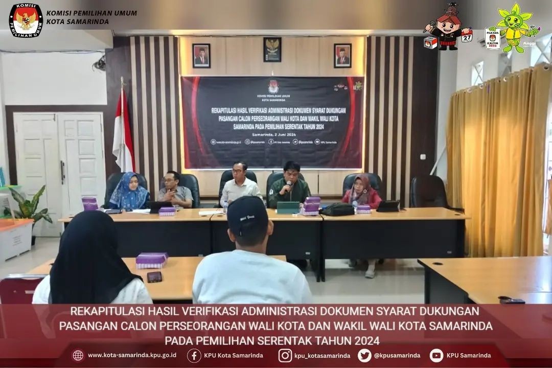 Hai #TemanPemilih, KPU Kota Samarinda bertempat di Aula Kantor KPU Kota Samarinda telah melaksanakan Rekapitulasi Hasil Verifikasi Administrasi Dokumen Syarat Dukungan Pasangan Calon Perseorangan dalam Pemilihan Wali Kota dan Wakil Wali Kota Samarinda Tahun 2024 pada tanggal 2 Juni 2024 .